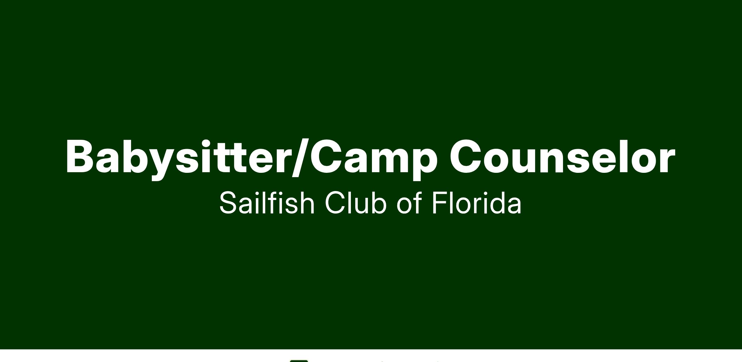 Part-time Babysitter/Camp Counselor position. Must have experience working with children in an interactive and enthusiastic capacity. Babysitting consists of supervising and engaging with Member children in our Kid's Room facilities during babysitting hours: Friday (night), Saturday (day) & Sunday (day/night). During Sailfish Club Camp weeks (Spring Break, Summer & Winter Break), Babysitters act as Camp Counselors (Monday through Friday).