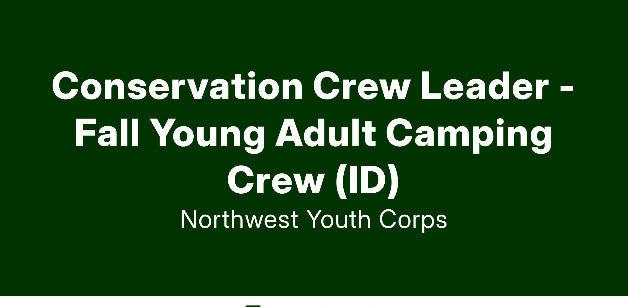 Location: Based out of Boise, ID but local housing is not needed as crews camp together for their entire session. Project locations generally include national forests, national parks, wilderness areas throughout the state of Idaho.