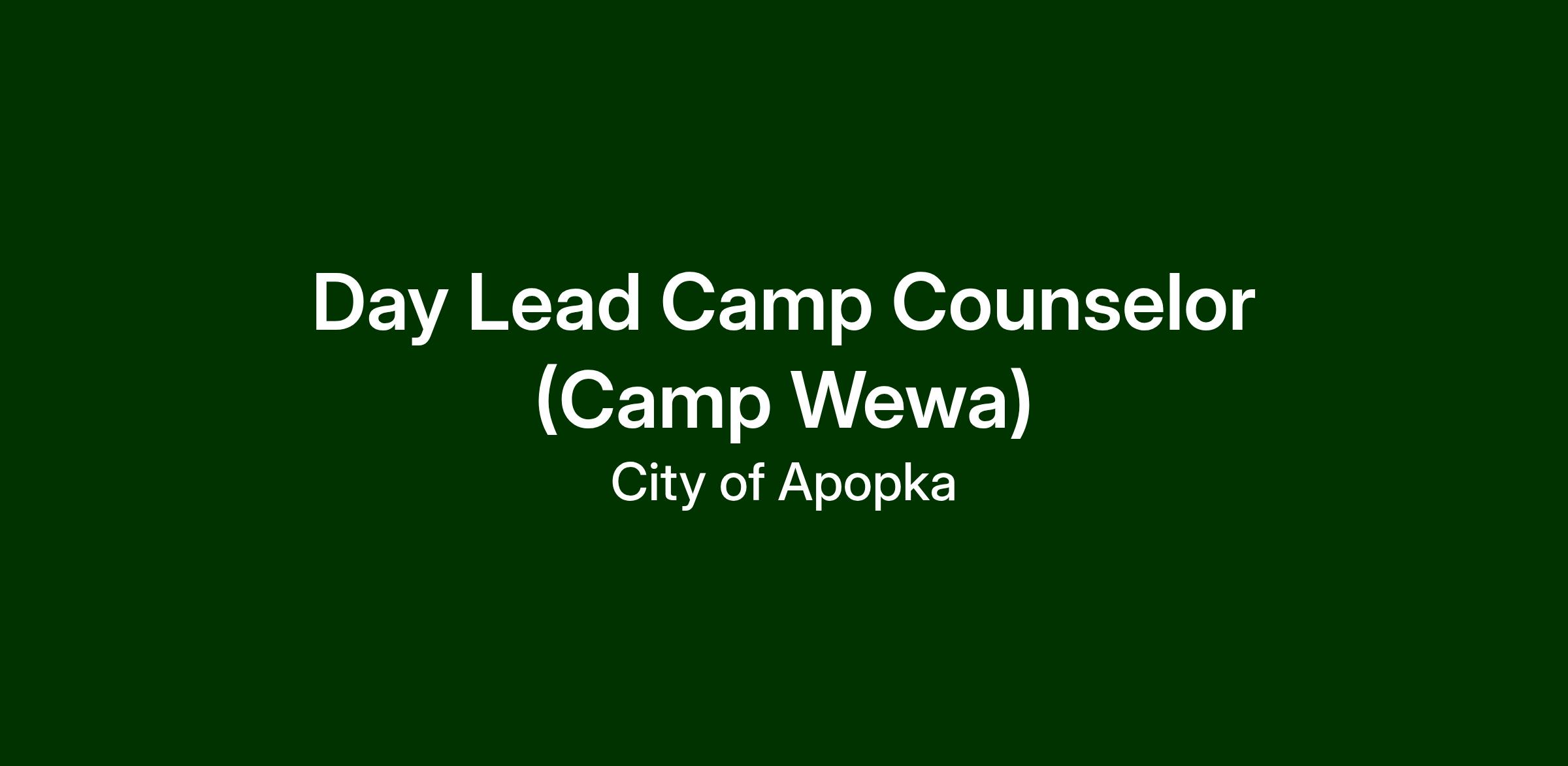 Primarily located at Camp Wewa, 221 S. Binion Road, Apopka, FL 32703. May work at any City owned buildings, parks, grounds and recreation facilities. All off-site locations and facilities utilized as part of the City's participation or involvement in an event, activity or job assignment
