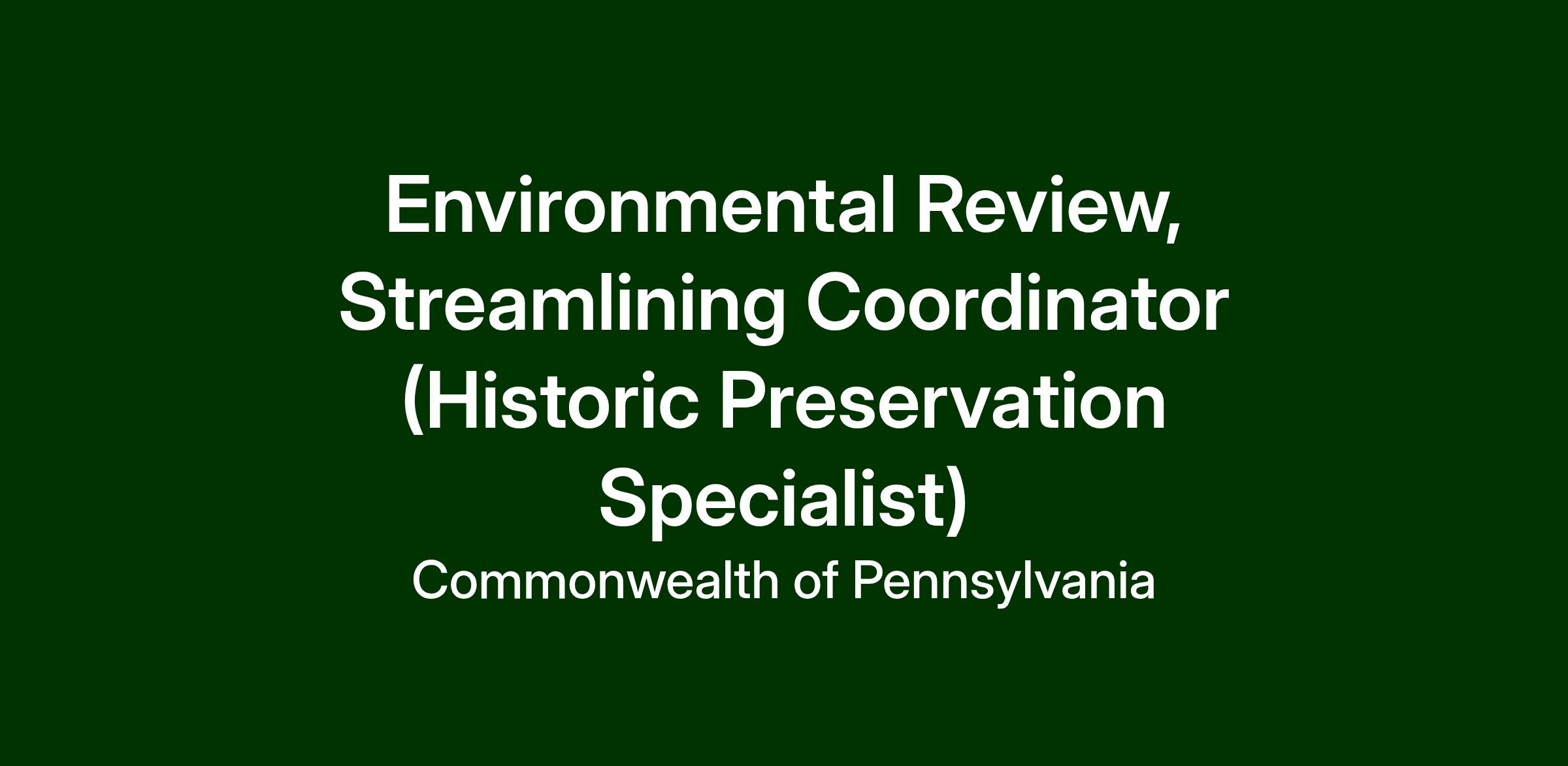 Are you searching for an exciting new professional opportunity to support the preservation of historic and archaeological resources in Pennsylvania? Achieve your goals in this Environmental Streamlining Coordinator role with the PA State Historic Preservation Office (PA SHPO). In this position, you will proactively assist agencies and applicants with fulfilling their legal obligation to consider historic resources during the planning and execution of projects, section 106 of the National Historic Preservation Act and the Pennsylvania History Code. Do not miss this unique and critical chance to help PA SHPO deliver an effective and efficient Environmental Review program!