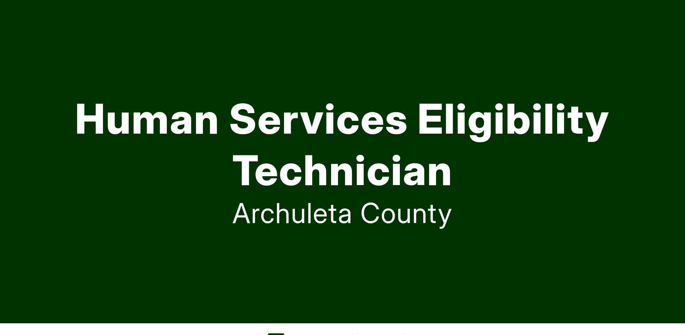Archuleta County is seeking qualified candidates for a full-time, Human Services Eligibility Technician. Our Eligibility Technician earns a competitive wage of $19.48 - $26.49 per hour.