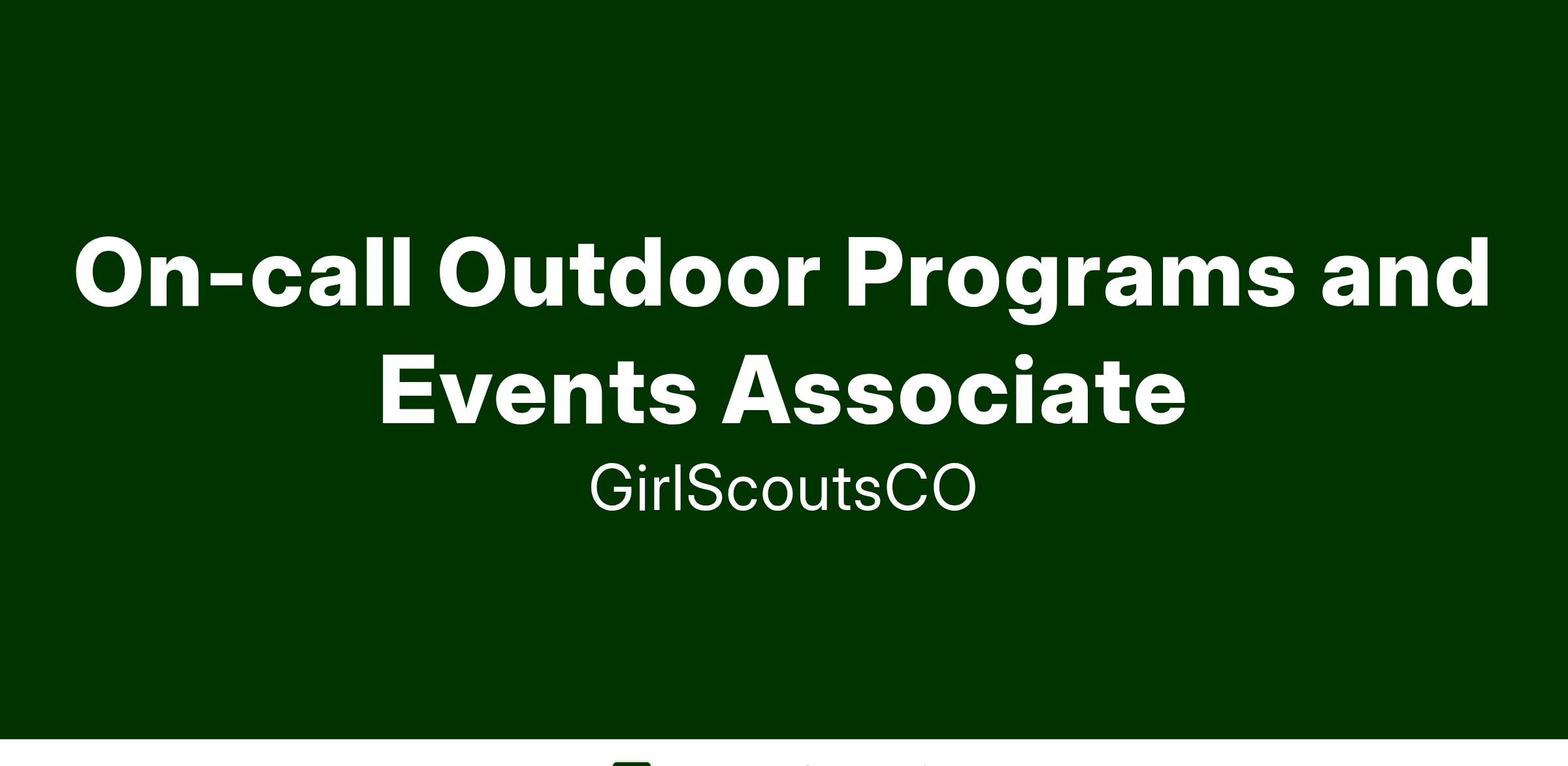 Outdoor Programs and Events On-Call staff lead year-round weekend and weeknight special programs across the state for Girl Scouts of Colorado (GSCO). This position is responsible for facilitating activities including outdoor adventure sports, environmental education, and camp games and programs. This position is responsible for supporting and delivering entry level outdoor experiences for Girl Scout members. This position will support community outdoor programs, partnership programs, special events, and other trips as needed. The scope of work is varied and may include day or evening programs at the Girl Scouts DreamLab, state, county, or city parks across Colorado, or Girl Scouts of Colorado properties. Work may also occasionally include weekend overnight camps or trips.