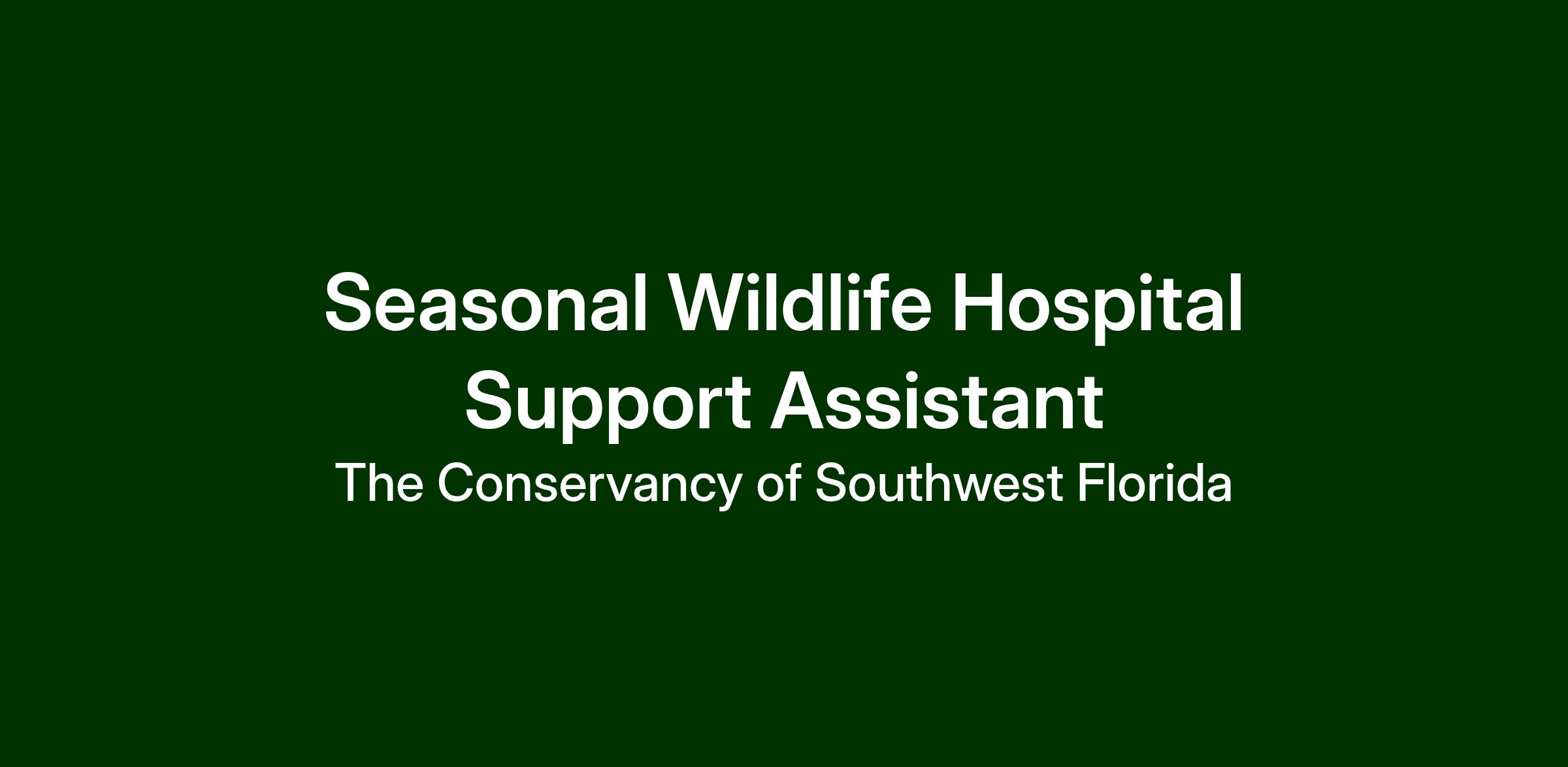 The Conservancy of Southwest Florida is seeking a Seasonal Wildlife Hospital Support Assistant to join the team at the von Arx Wildlife Hospital from May 1 through September 30. This full-time seasonal position supports our busiest rehabilitation months and offers a unique opportunity to gain hands-on experience in a high-volume wildlife hospital setting. Pending budget approval and organizational need, this role may transition into a full-time, permanent position Oct. 1 2026. Candidates who demonstrate strong clinical aptitude, teamwork, and a deep commitment to wildlife conservation will be considered for long-term placement.